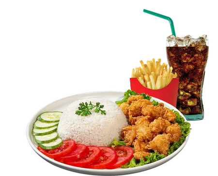 Combo Gà Viên gây “nghiện” với từng viên gà vàng giòn rụm, ăn kèm cơm trắng chất lượng cùng khoai tây chiên và nước giải khát. Chốt đơn ngay, bao no bao ghiền!